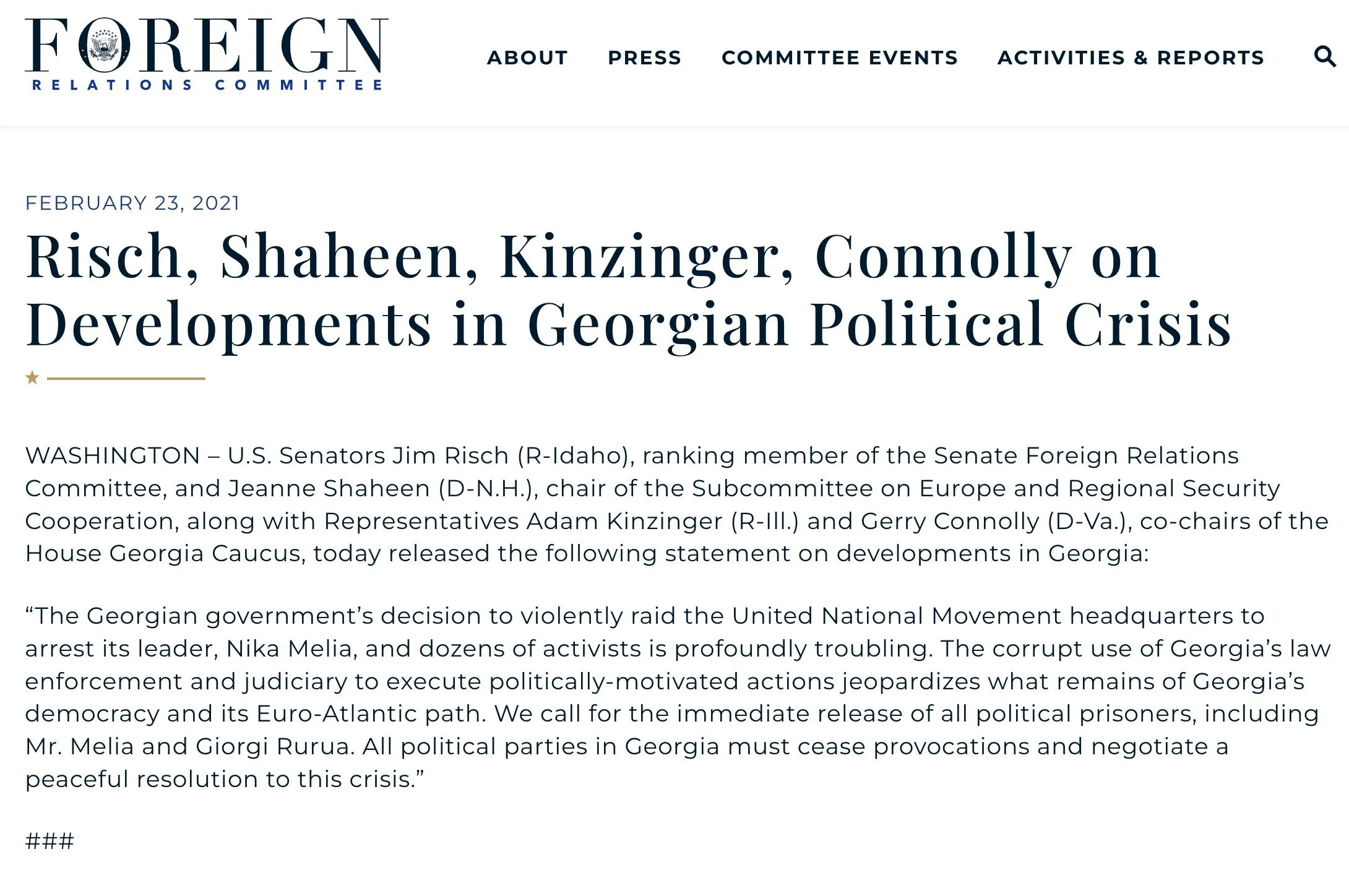 Halfway around the world, though, the US Foreign Relations Committee issued a statement condemning Georgia for raiding the United National Movement party’s headquarters and calling for the release of all political prisoners of which they explicitly named Giorgi Rurua.